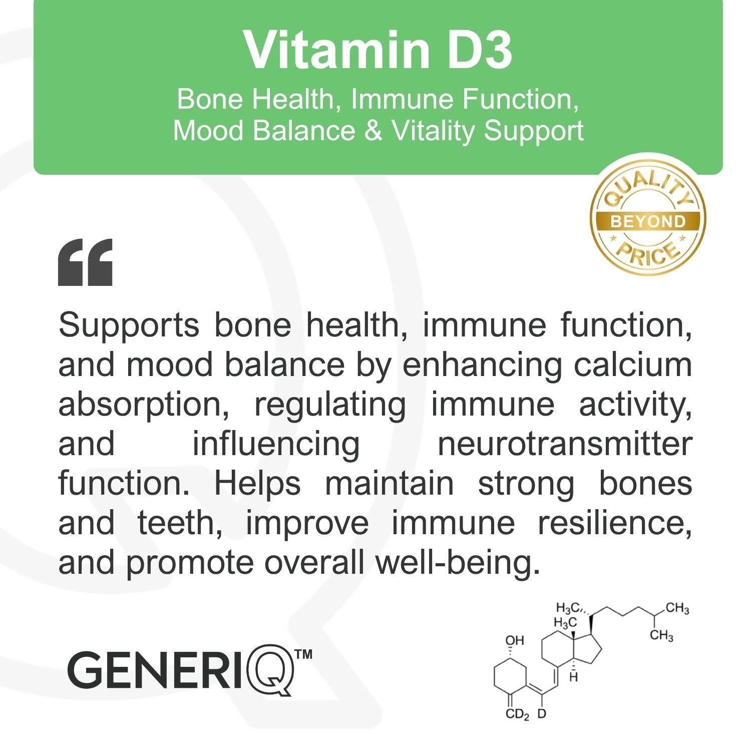 Vitamin D3 helps regulate calcium and phosphorus absorption for bone strength, supports immune cell communication, and influences serotonin production to aid mood regulation and energy balance.