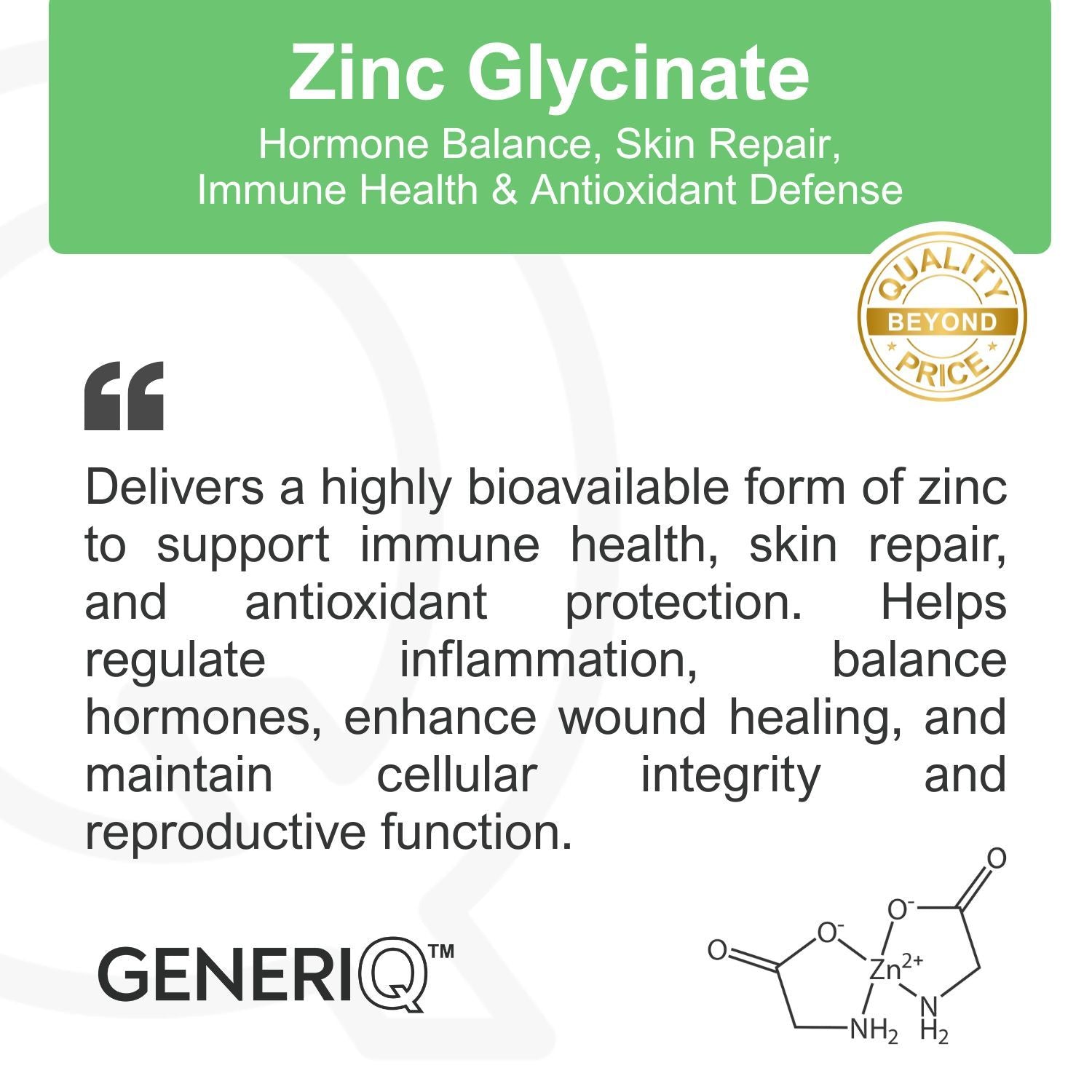 Zinc functions as a cofactor for over 300 enzymatic reactions involved in immune modulation, antioxidant defense, hormone signaling, and skin healing. Zinc glycinate is a chelated compound bound to the amino acid glycine, increasing its bioavailability and reducing gastrointestinal side effects compared to other zinc forms.