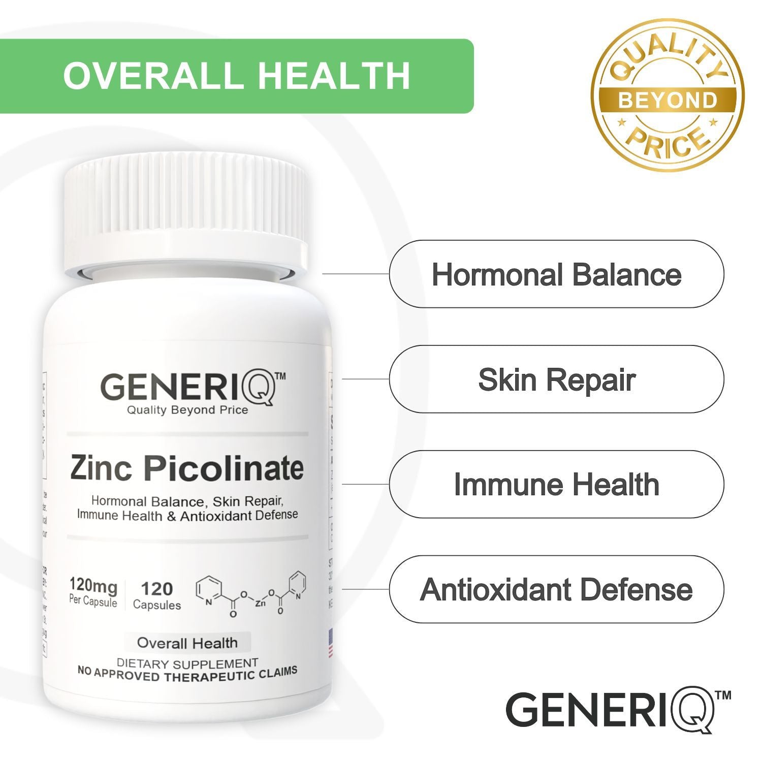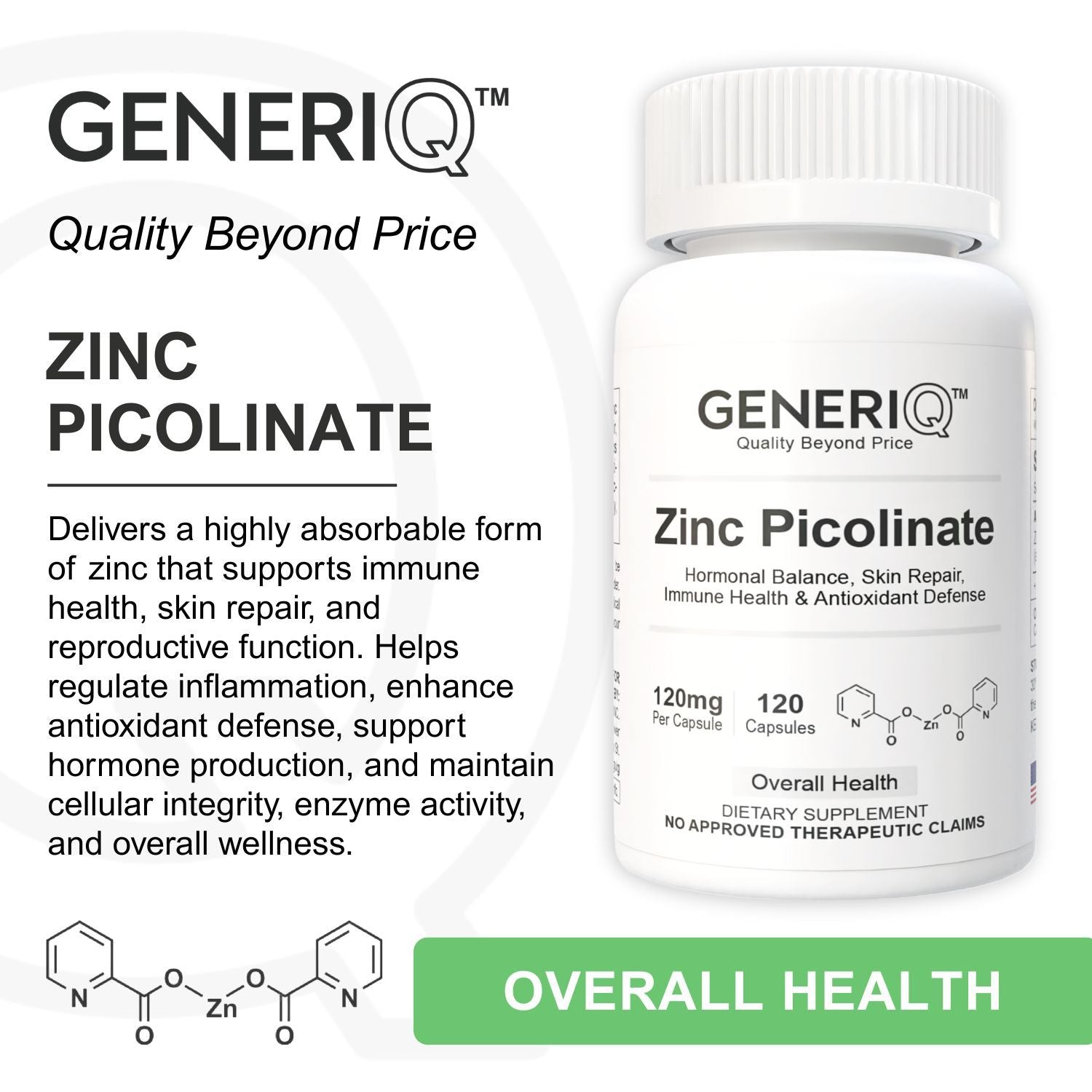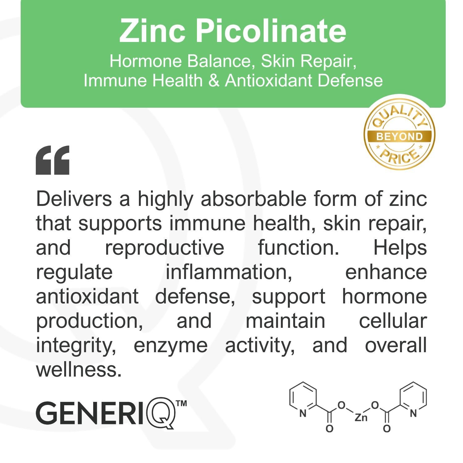 Zinc picolinate is formed by binding zinc to picolinic acid, which facilitates better intestinal absorption compared to other inorganic forms. Zinc acts as a catalytic, structural, and regulatory ion in hundreds of enzymatic processes involved in hormone production, immune response, antioxidant defense, and tissue maintenance.
